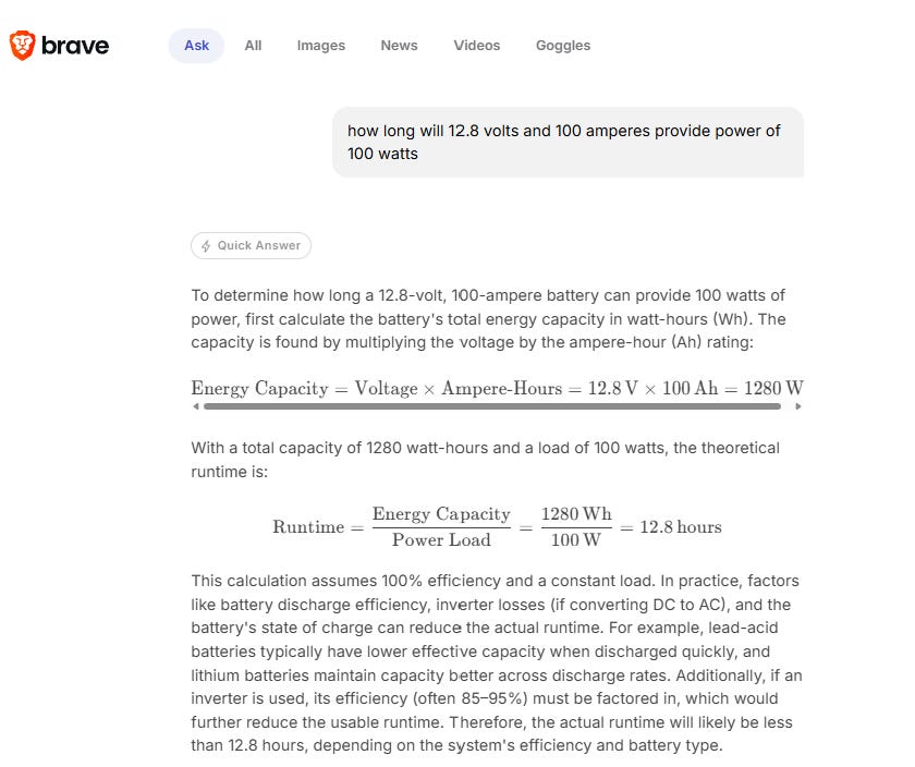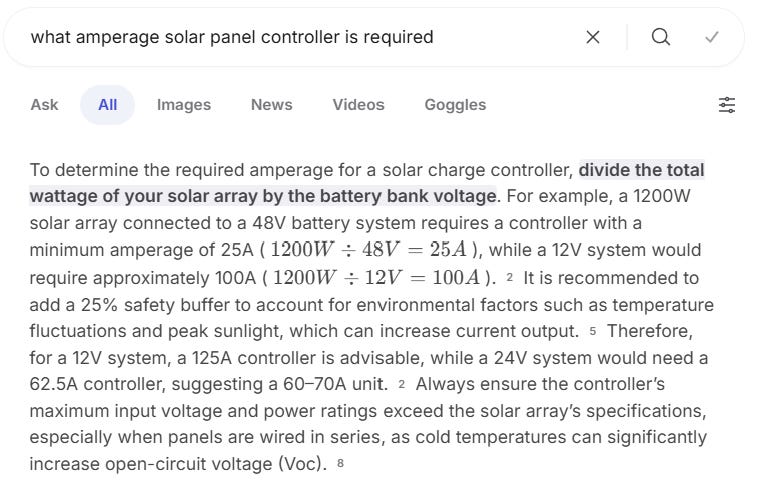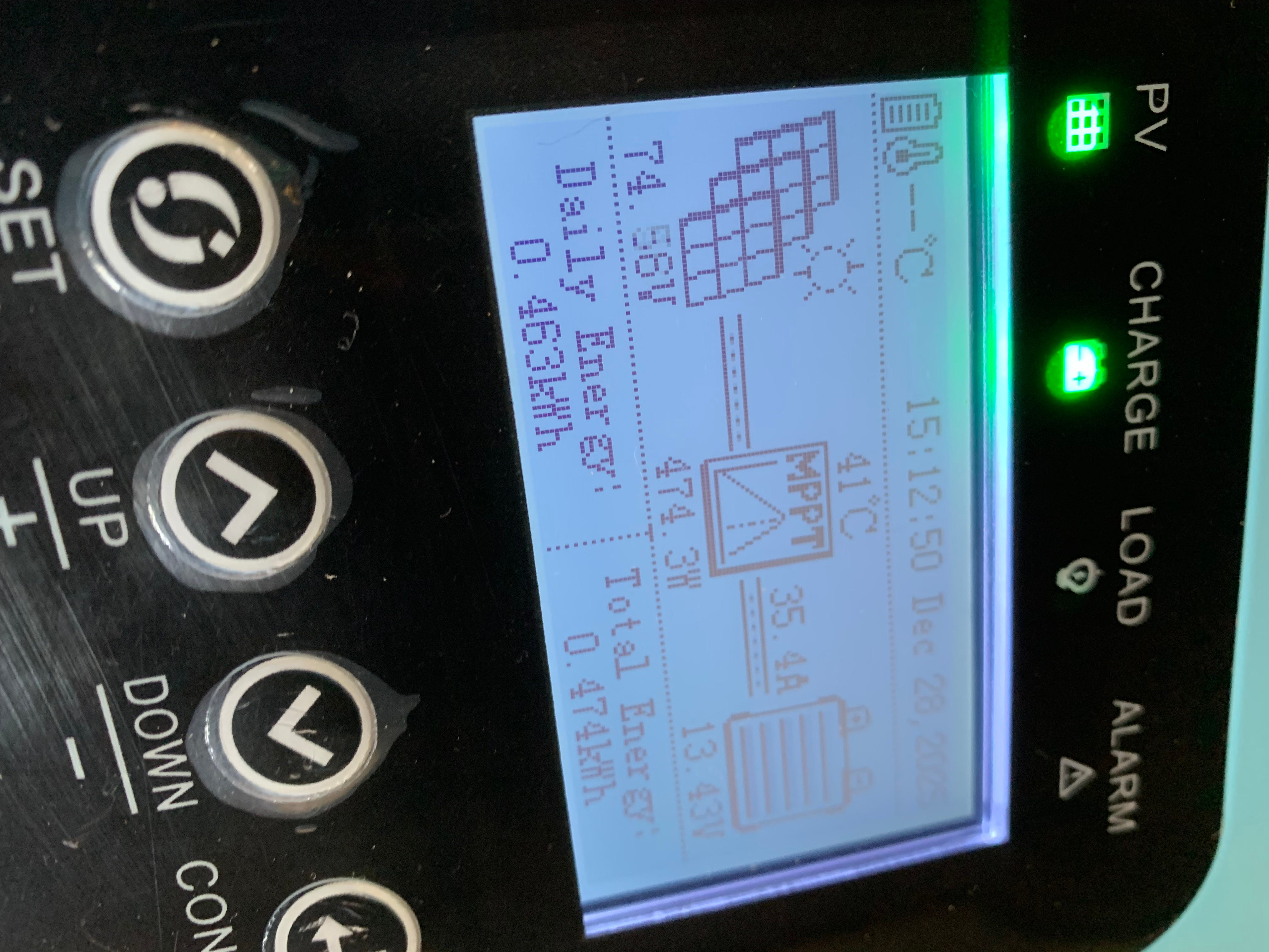 As is stated above, when I commenced this effort a few days ago I acknowledged “I have a lot left to learn”. I recognized that; even if I wasn’t exactly sure what I was gonna learn. But I’ve had the system a few days and had a fuse blow on one of the cords and noticed some anomalies in some of the “readings” I was getting. I have come to learn that some of the wiring is “undersized” as is the solar charge controller. So, I have had to order some more cords and a new controller. This project is “on hold” until they arrive. It may not be until 2026 that I get back to this - but the good thing is the panels are in place and functioning properly and I have a general understanding of what is needed, but as they say “the devil is in the details”. Still, I also think often the best way to learn is through trial and error (as long as one doesn’t “burn the house down! - 😊). So, when everything arrives I’ll come back with the details, and in the meantime here is one specific thing I can share: