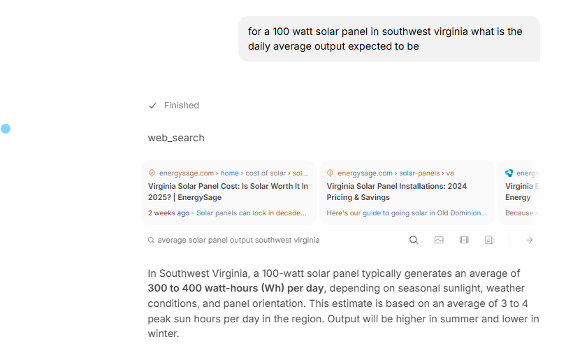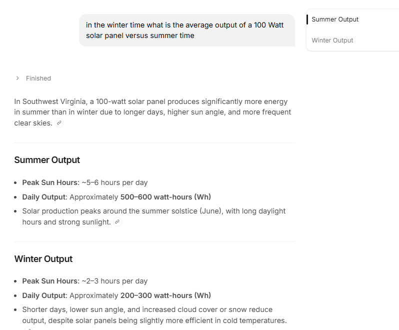 OK - looks like the Buffalo Bills are getting their butts handed to them so far - so why waste time watching a “game” when I could post some more details - So the first detail is best I can tell so far the battery/inverter device - while it can put out some peak energy seems limited for “input wattage”. In other words if the amount of energy being provided by the panels exceeds this “limit” (seems to be about 300 Watts) and the energy demand from the inverter exceeds this - then the battery will lose its charge. That is an issue. So what I did is unpacked in “inverter” I purchased a long time ago and took the battery/inverter out of the sequence. I will keep this battery “trickle-charged” but ideally the setup will use all energy coming in but keep the batteries fully charged - so the key is to balance input and output energy wise. Here is an image of the inverter I have connected and this is followed by a sequence of questions I asked the Brave “ai”: